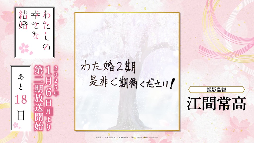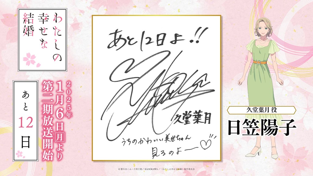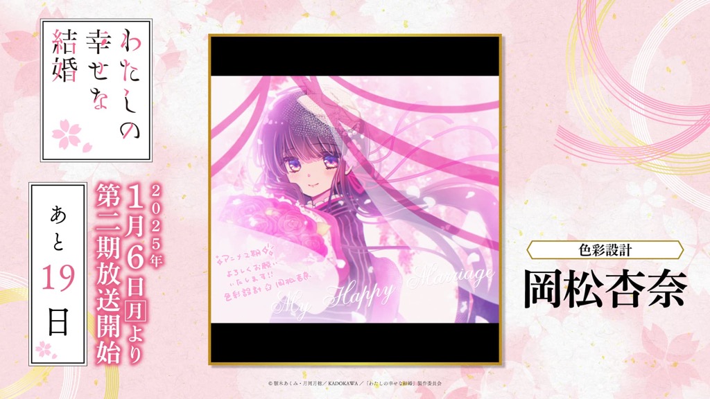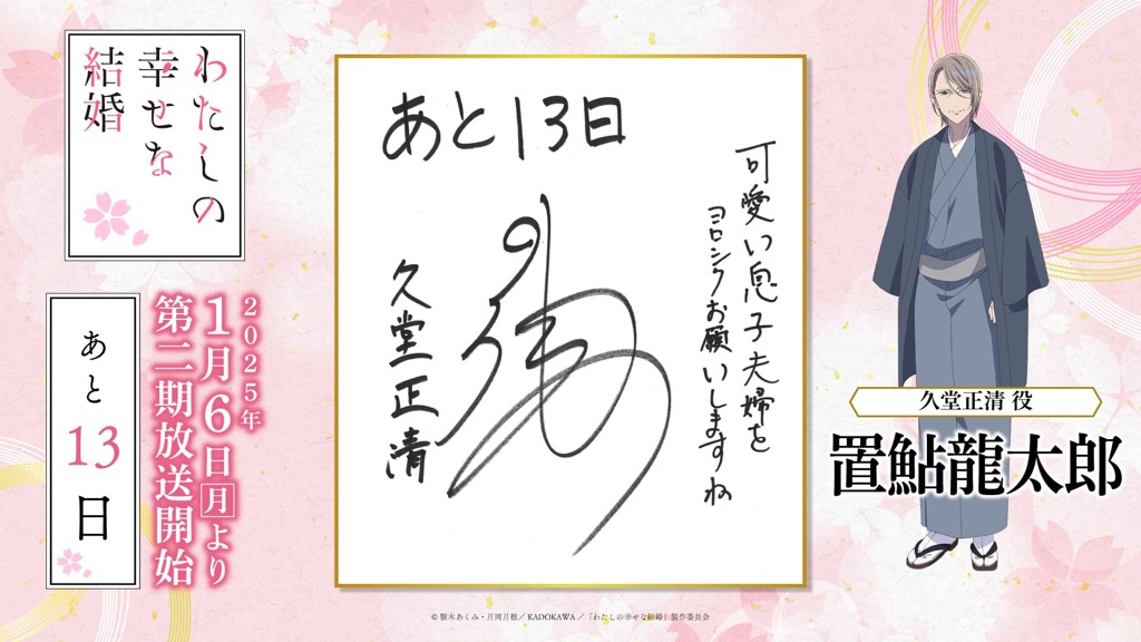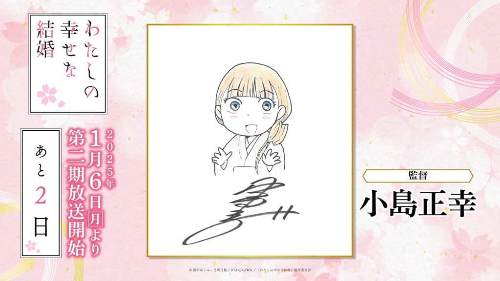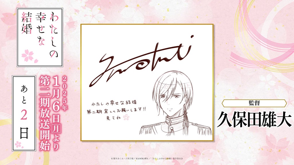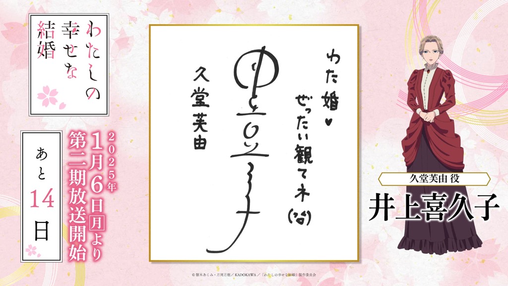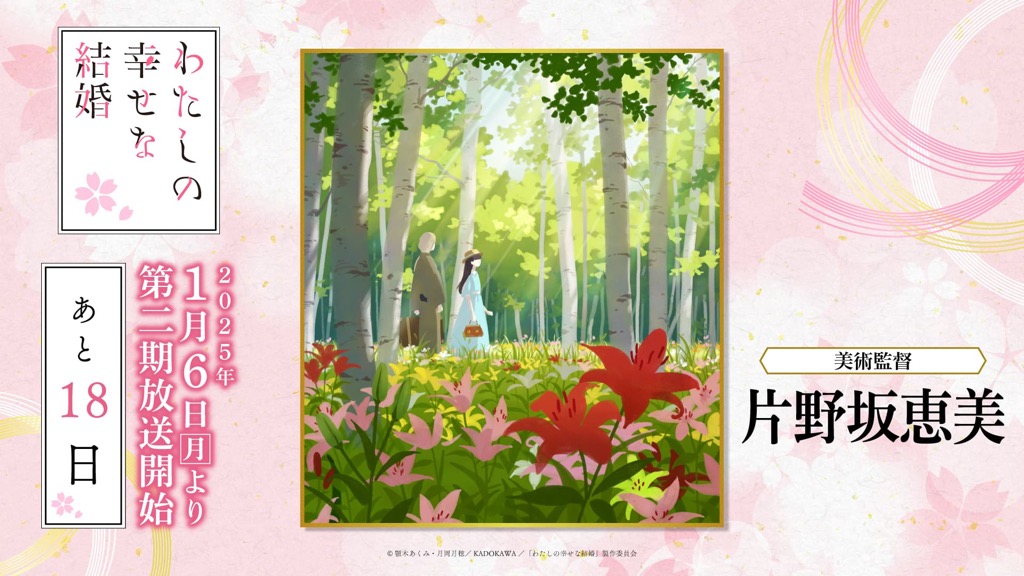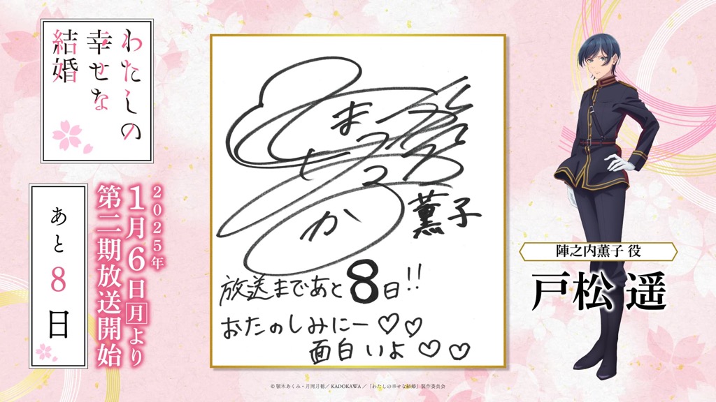 1月6日(月)のTVアニメ「わたしの幸せな結婚」第二期の放送開始に向けて、「わた婚」を彩るキャスト、原作、制作、音楽など、各所関係者の皆さまからイラストやコメントをいただきました!