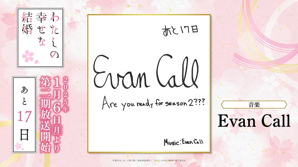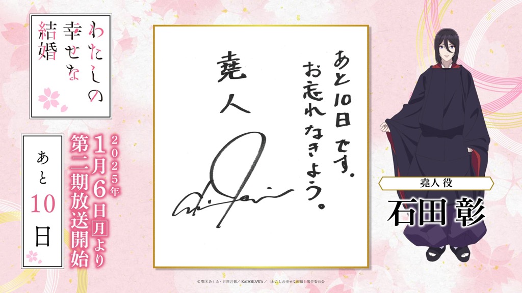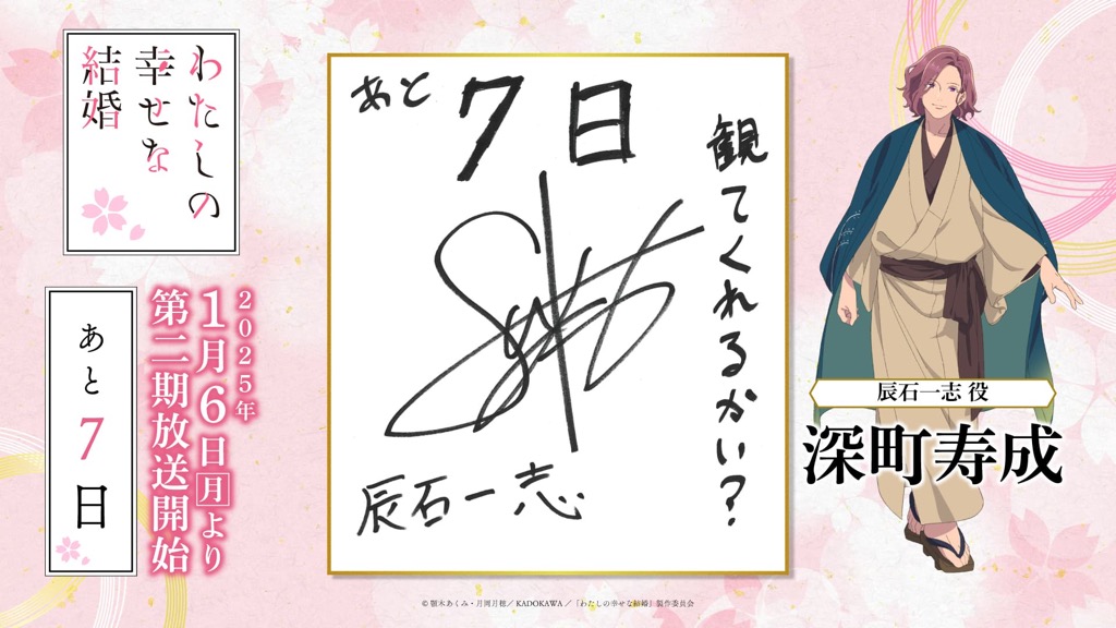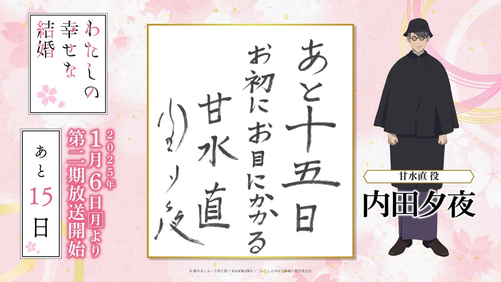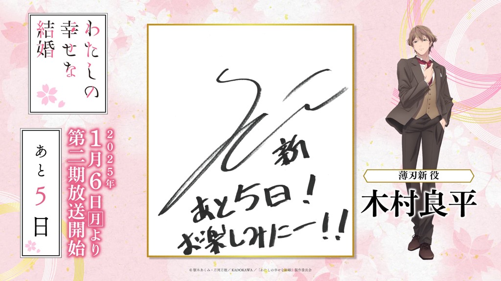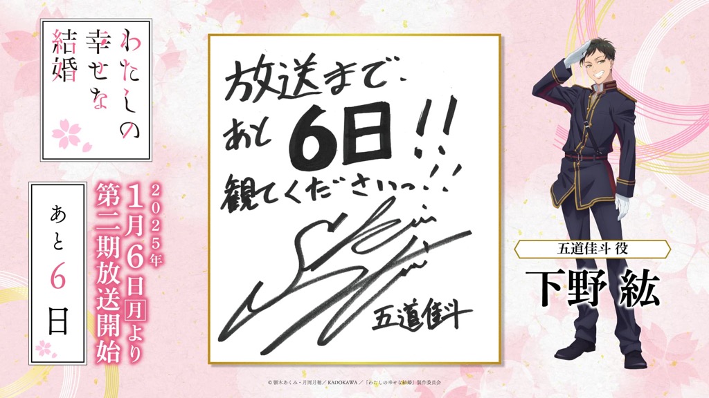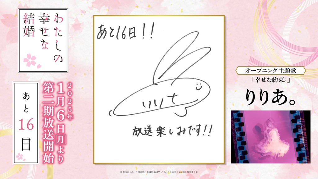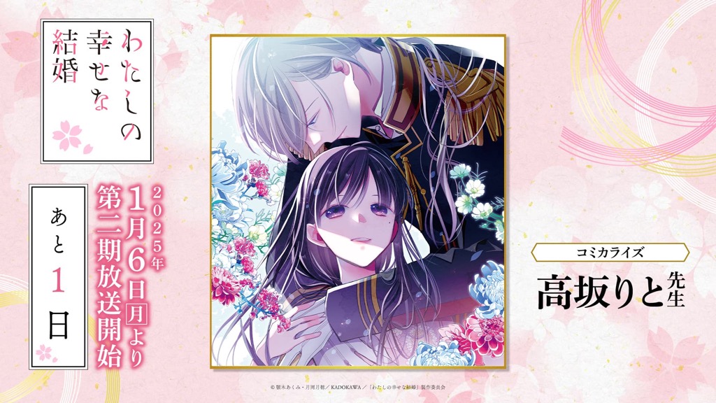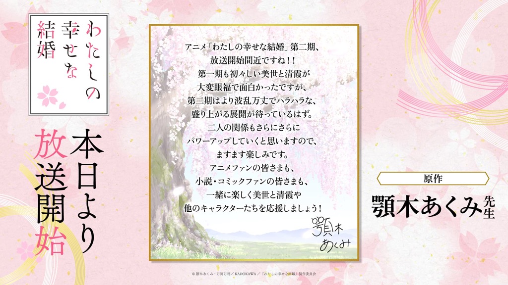 1月6日(月)のTVアニメ「わたしの幸せな結婚」第二期の放送開始に向けて、「わた婚」を彩るキャスト、原作、制作、音楽など、各所関係者の皆さまからイラストやコメントをいただきました!